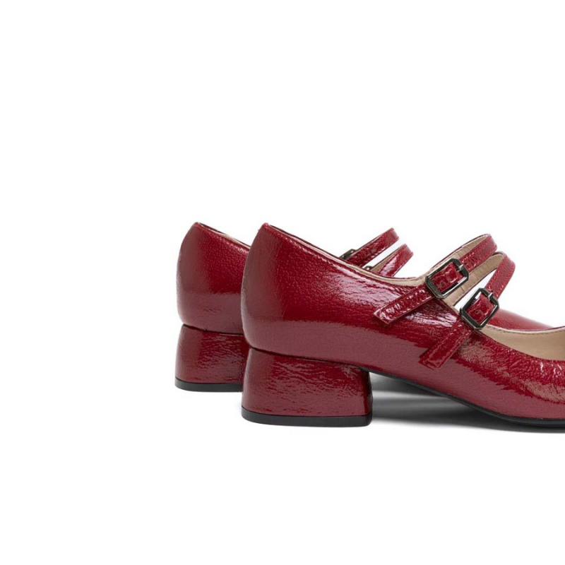 Mercedes de mujer fabricada en charol piel color rojo con tacón bajo y doble correa con hebilla.